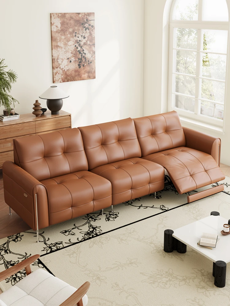 French Electric Reclining Genuine Leather Sofa - Wall-Free Design, Vintage Style with Top-Grade Cowhide, Perfect for Your Living Room Cloud Sofa Experience