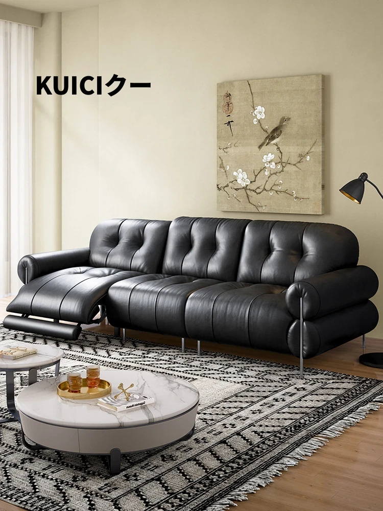 2025年新款フレンチヴィンテージ電動機能ソファー - 壁にぴったり!伸縮自在の本革ダイレクトクラウドブラックリクライナーで、極上のくつろぎをお届けします。