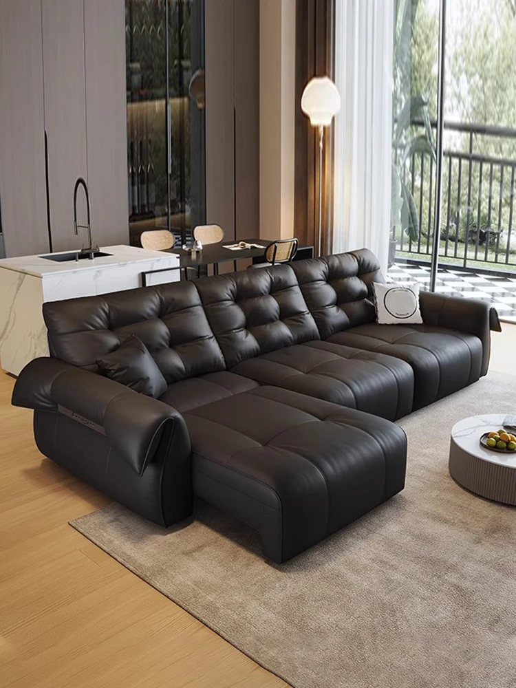 壁に寄りかからない雲型電動多機能本革ソファ - フレンチヴィンテージスタイルのリビング用、ブラックトップグレインレザー製ソファベッド。快適さとスタイルを兼ね備えた理想の空間を演出します!