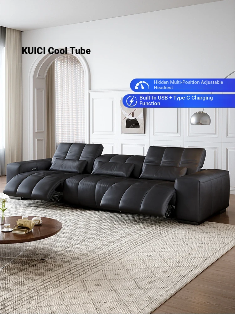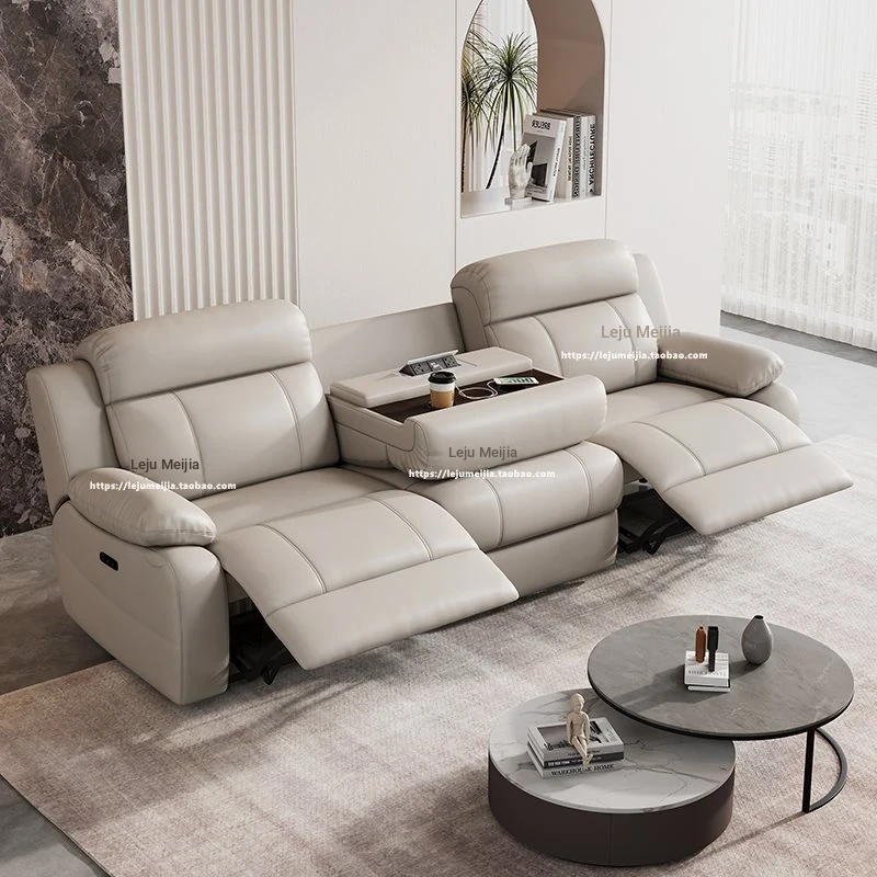 Electric Reclining Genuine Leather Sofa - Modern Minimalist Design for Living Room - Top Grain Cowhide, Three-Seater, Straight Line Style
